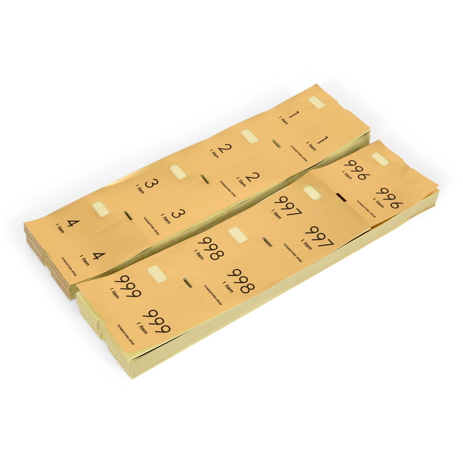 Replace your plastic cloakroom tags with our high-quality pre-printed cloakroom tickets in GOLD with BLACK PRINT. A value pack containing 1000 coat check tickets is an easy solution for events. Use the numbered sequences to check your turnover. Need tickets more frequently? Look at our Coat Check Ticket printer, an excellent solution for printing your tickets — up to 50% cheaper than pre-printed tags.