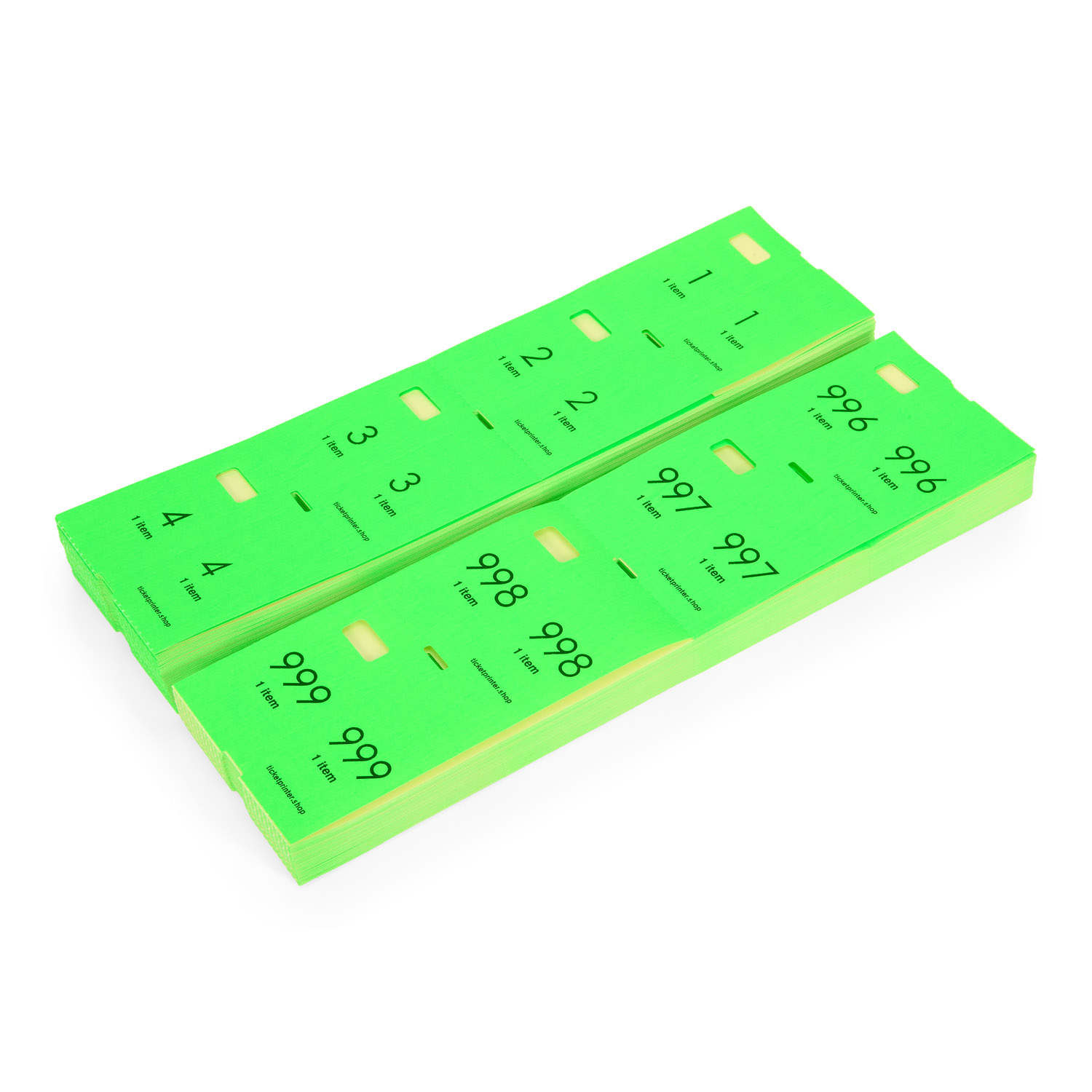 Replace your plastic cloakroom tags with our high-quality pre-printed cloakroom tickets in NEON GREEN. A value pack containing 1000 coat check tickets is an easy solution for events. Use the numbered sequences to check your turnover. Need tickets more frequently? Look at our Coat Check Ticket printer, an excellent solution for printing your tickets — up to 50% cheaper than pre-printed tags.